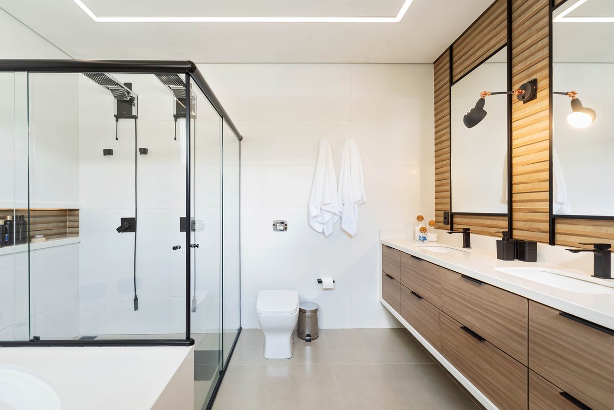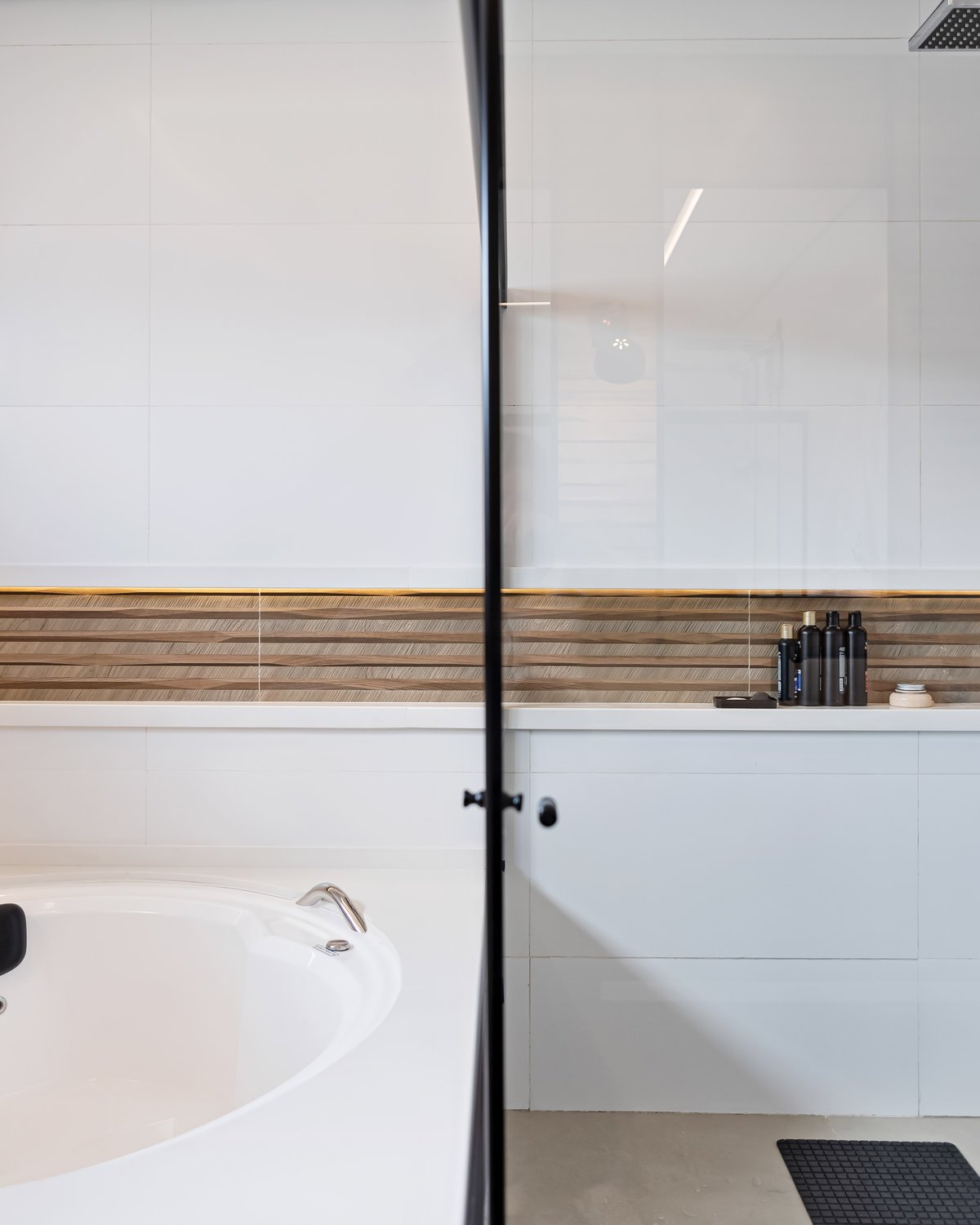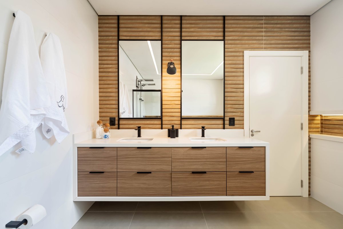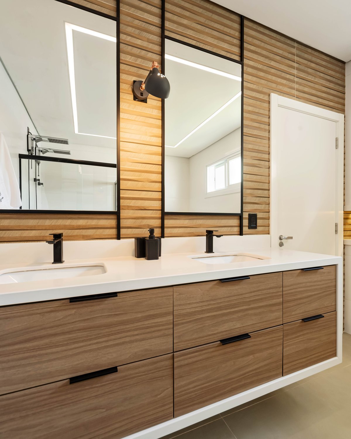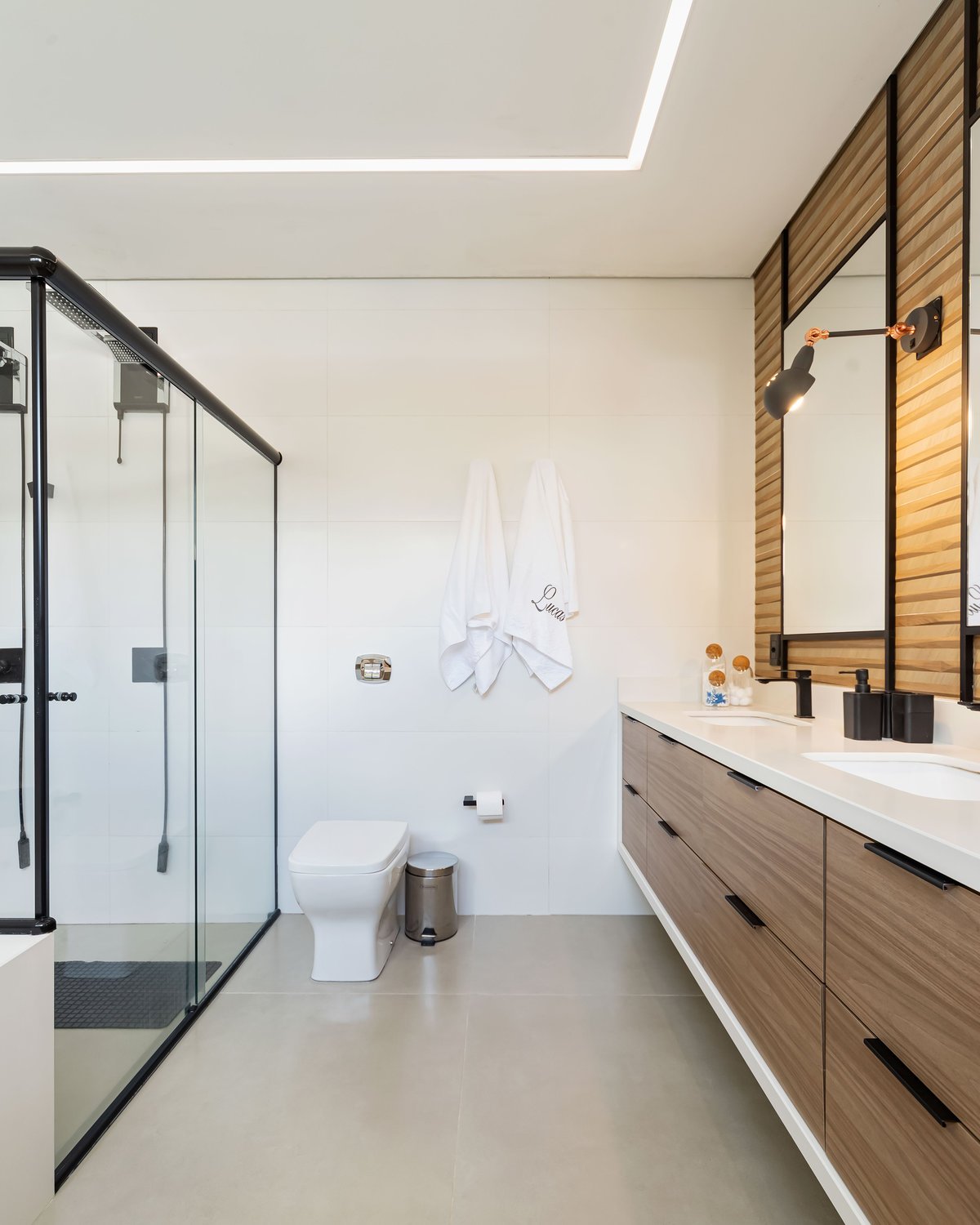 Esse banheiro de suíte é o sonho de qualquer casal: amplo, funcional e cheio de charme. Conta com dois chuveiros, banheira e duas cubas, garantindo praticidade e mais conforto no dia a dia. A paleta predominante em branco traz leveza ao espaço, enquanto os acabamentos em preto conferem imponência e um leve contraste ao ambiente. O revestimento ripado na parede das pias e no nicho se estende por duas paredes, adiciona textura, conforto e um toque de exclusividade ao design.