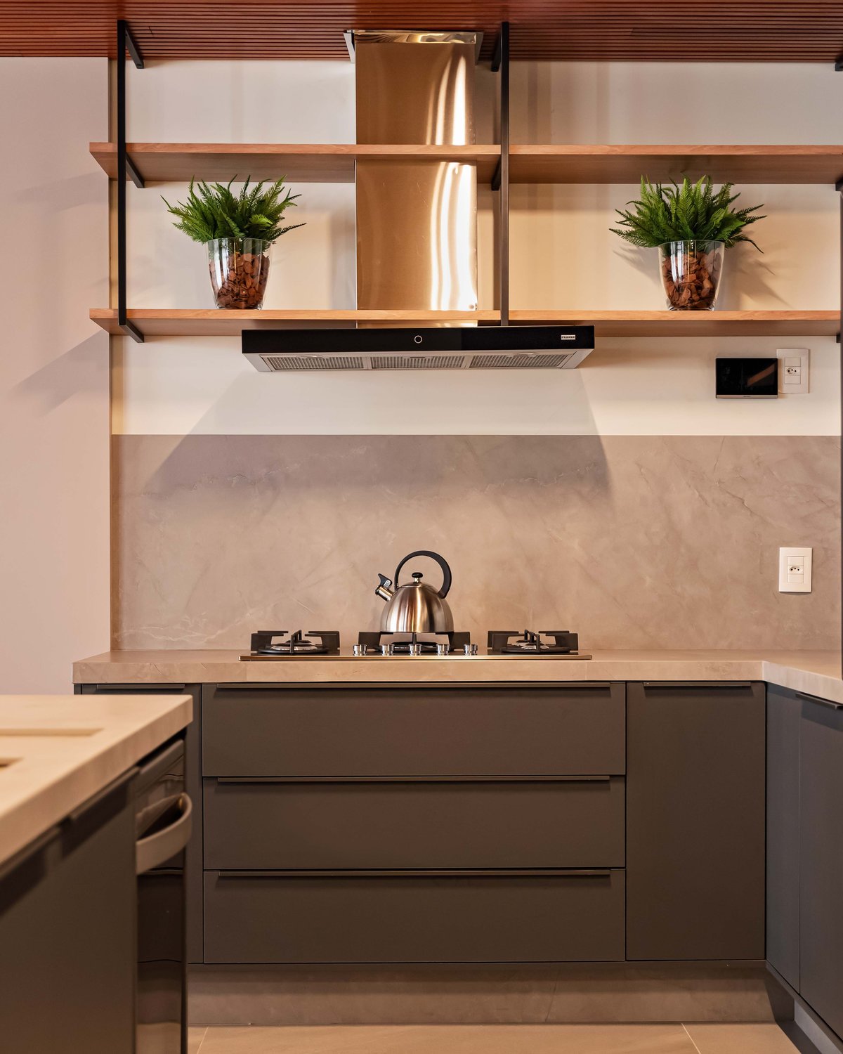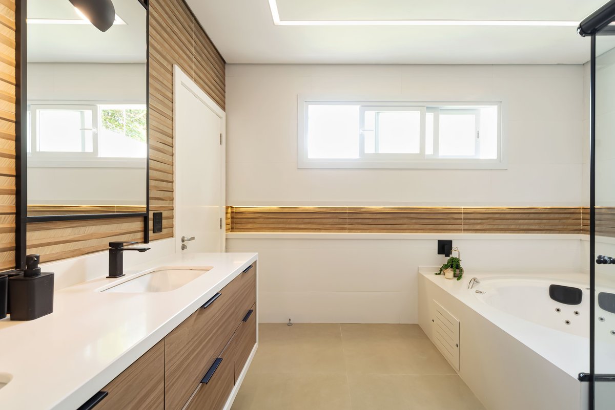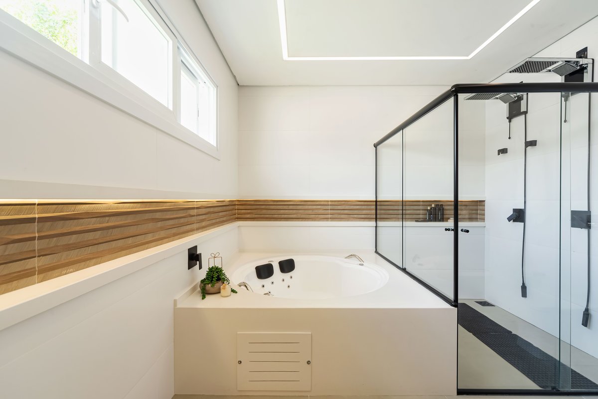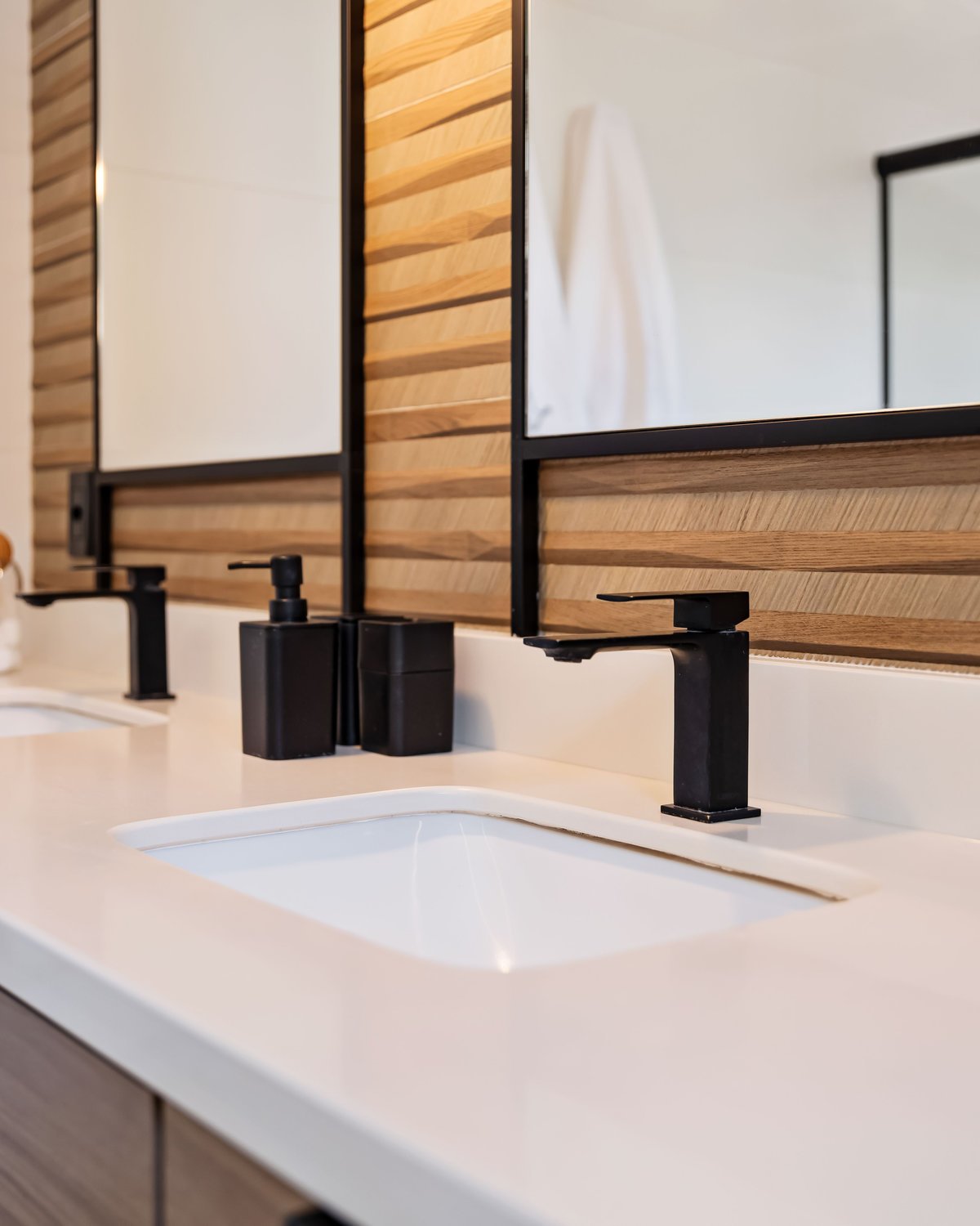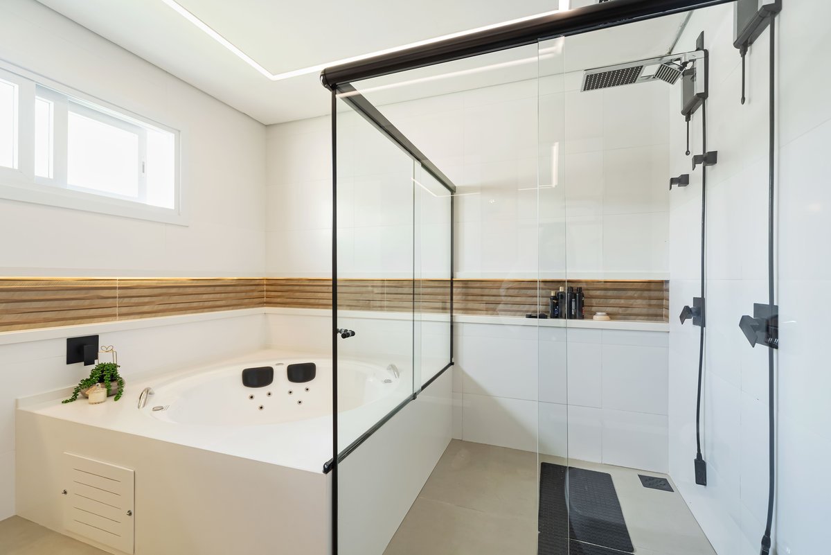 Esse banheiro de suíte é o sonho de qualquer casal: amplo, funcional e cheio de charme. Conta com dois chuveiros, banheira e duas cubas, garantindo praticidade e mais conforto no dia a dia. A paleta predominante em branco traz leveza ao espaço, enquanto os acabamentos em preto conferem imponência e um leve contraste ao ambiente. O revestimento ripado na parede das pias e no nicho se estende por duas paredes, adiciona textura, conforto e um toque de exclusividade ao design.