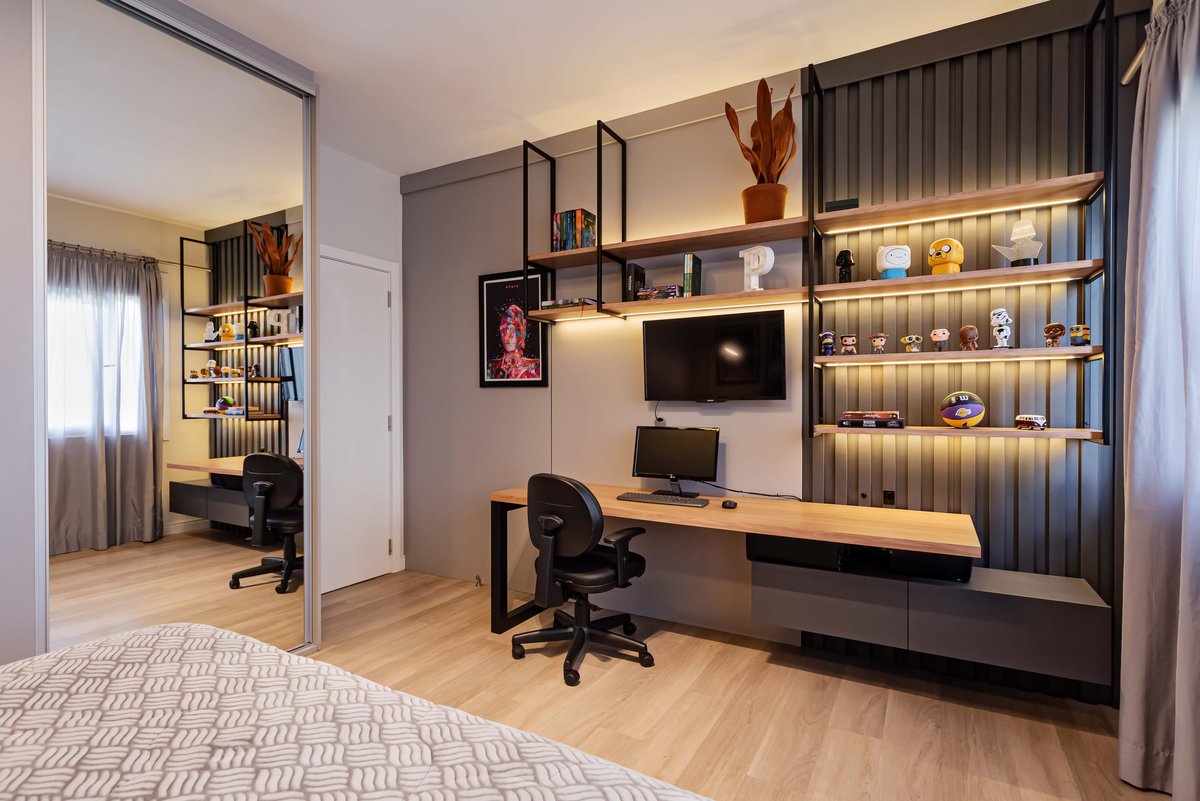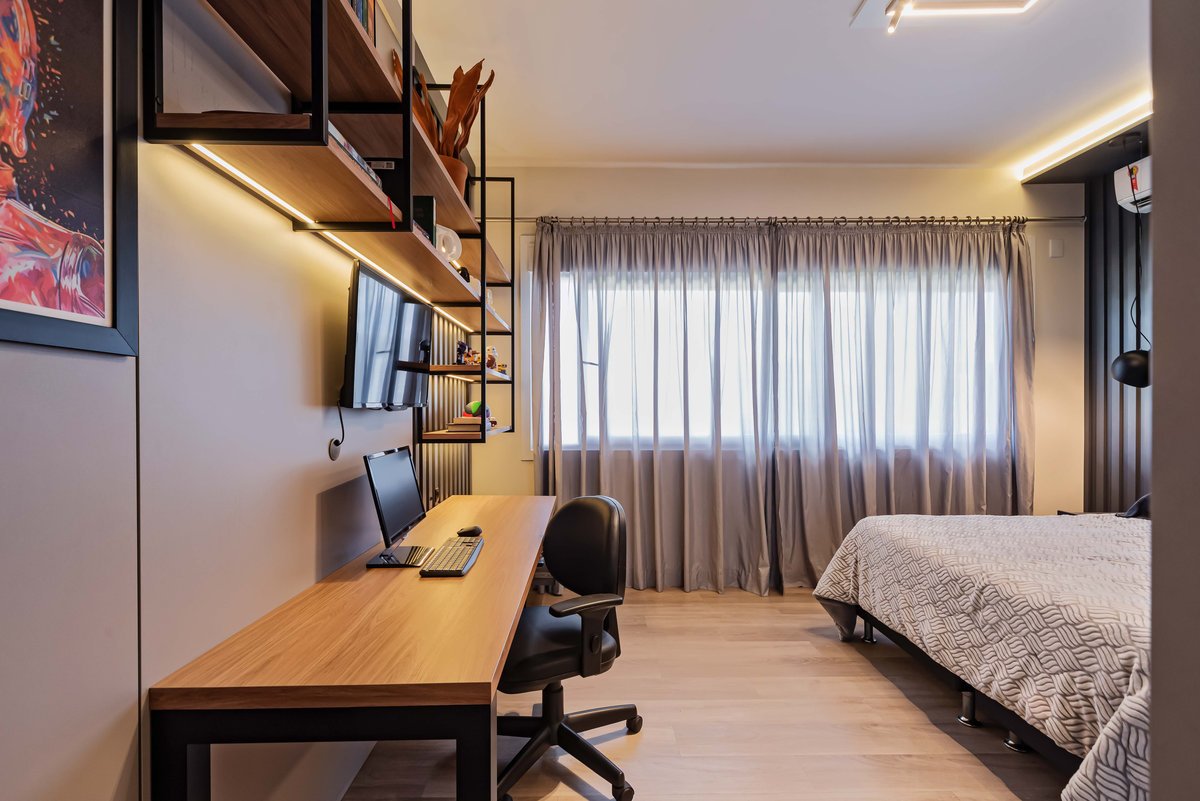 A adolescência é uma fase cheia de descobertas, mudanças e desafios — e o quarto precisa acompanhar esse momento tão especial. Este dormitório foi projetado para um adolescente de 14 anos, unindo funcionalidade e personalidade.