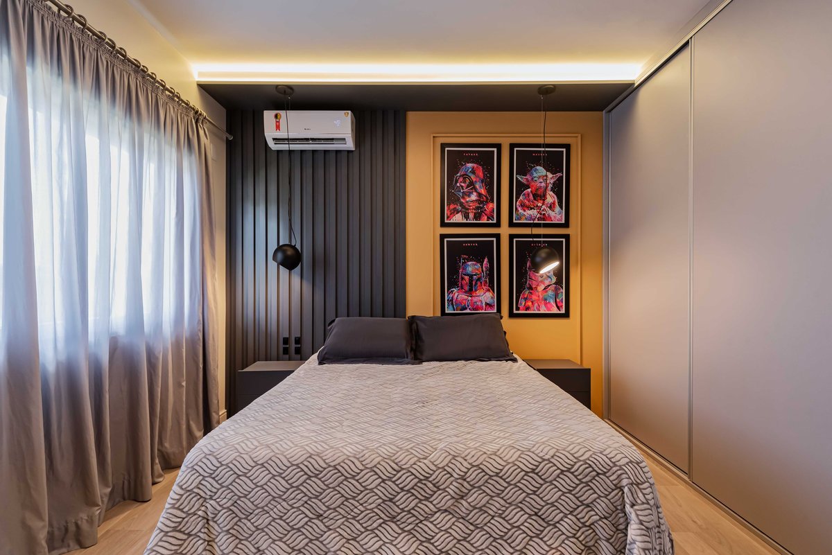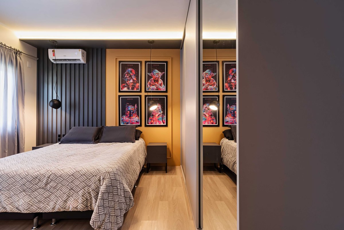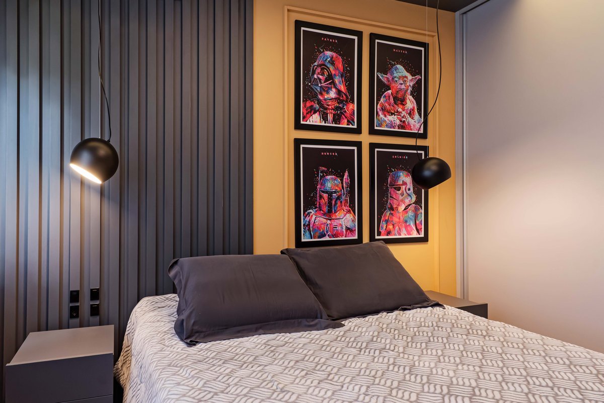 Para o visual, optamos por cores neutras e prateleiras com estrutura de ferro, trazendo um toque moderno com presença para o espaço. E para romper com a seriedade típica dessa fase, apostamos em um painel de cabeceira amarelo e luminárias grandes de apoio, que trazem um contraste visual e mais vitalidade ao ambiente.