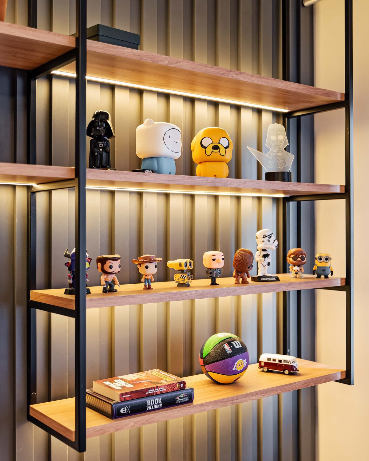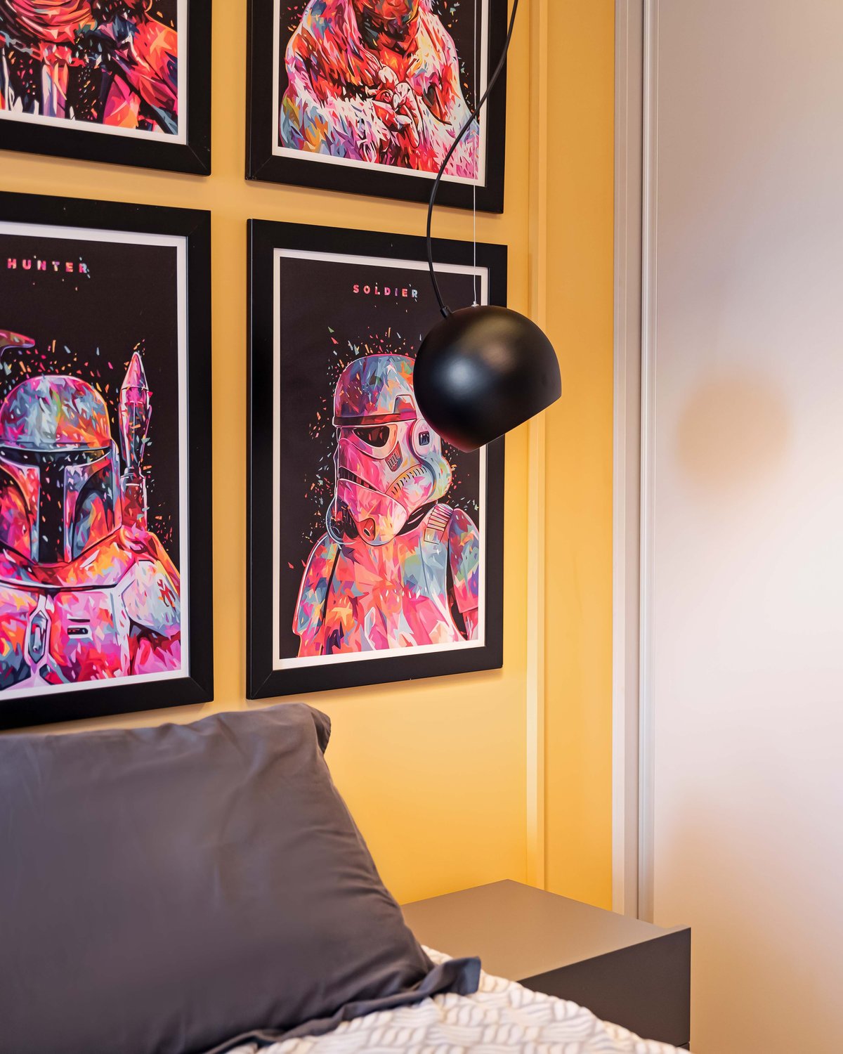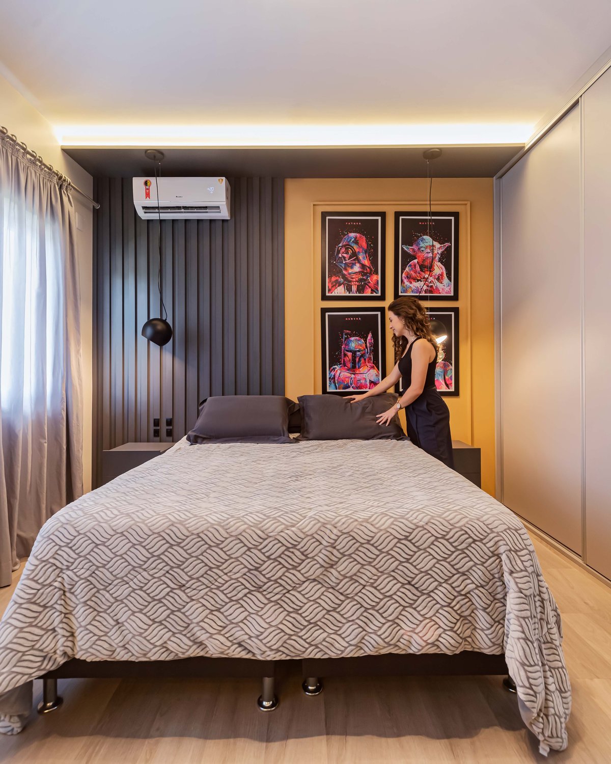 Para o visual, optamos por cores neutras e prateleiras com estrutura de ferro, trazendo um toque moderno com presença para o espaço. E para romper com a seriedade típica dessa fase, apostamos em um painel de cabeceira amarelo e luminárias grandes de apoio, que trazem um contraste visual e mais vitalidade ao ambiente.