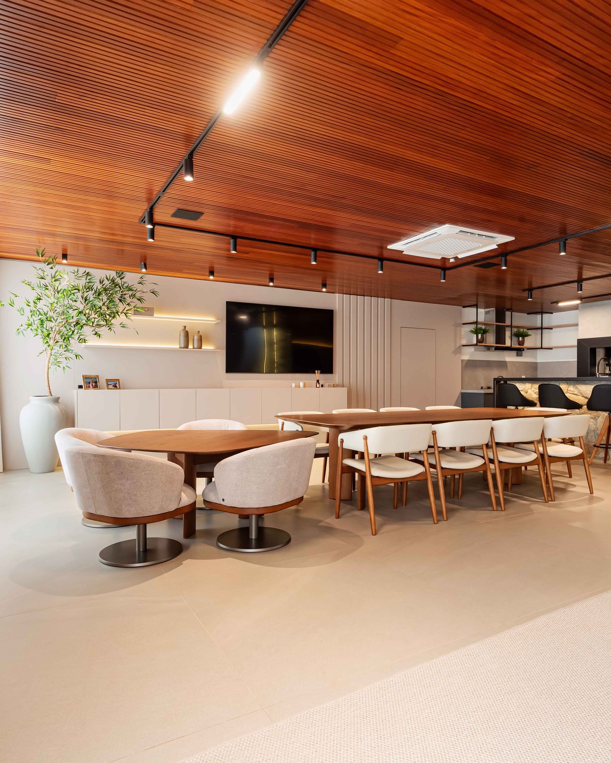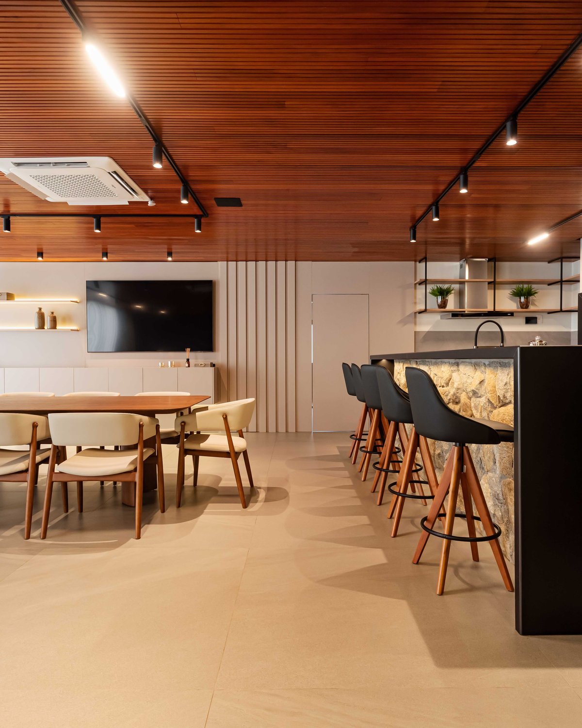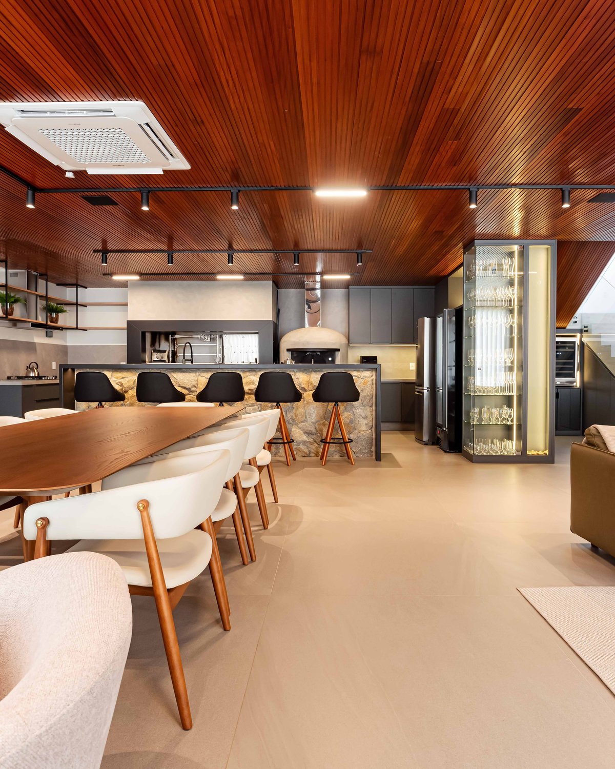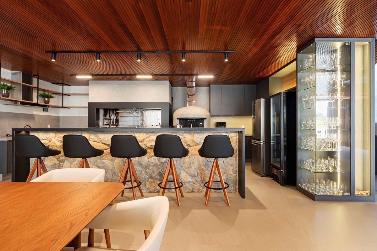 Cada detalhe traduz a essência do design: a adega em ferro, o jardim integrado e o forro ripado em madeira garapeira transformam o espaço com elegância e personalidade.