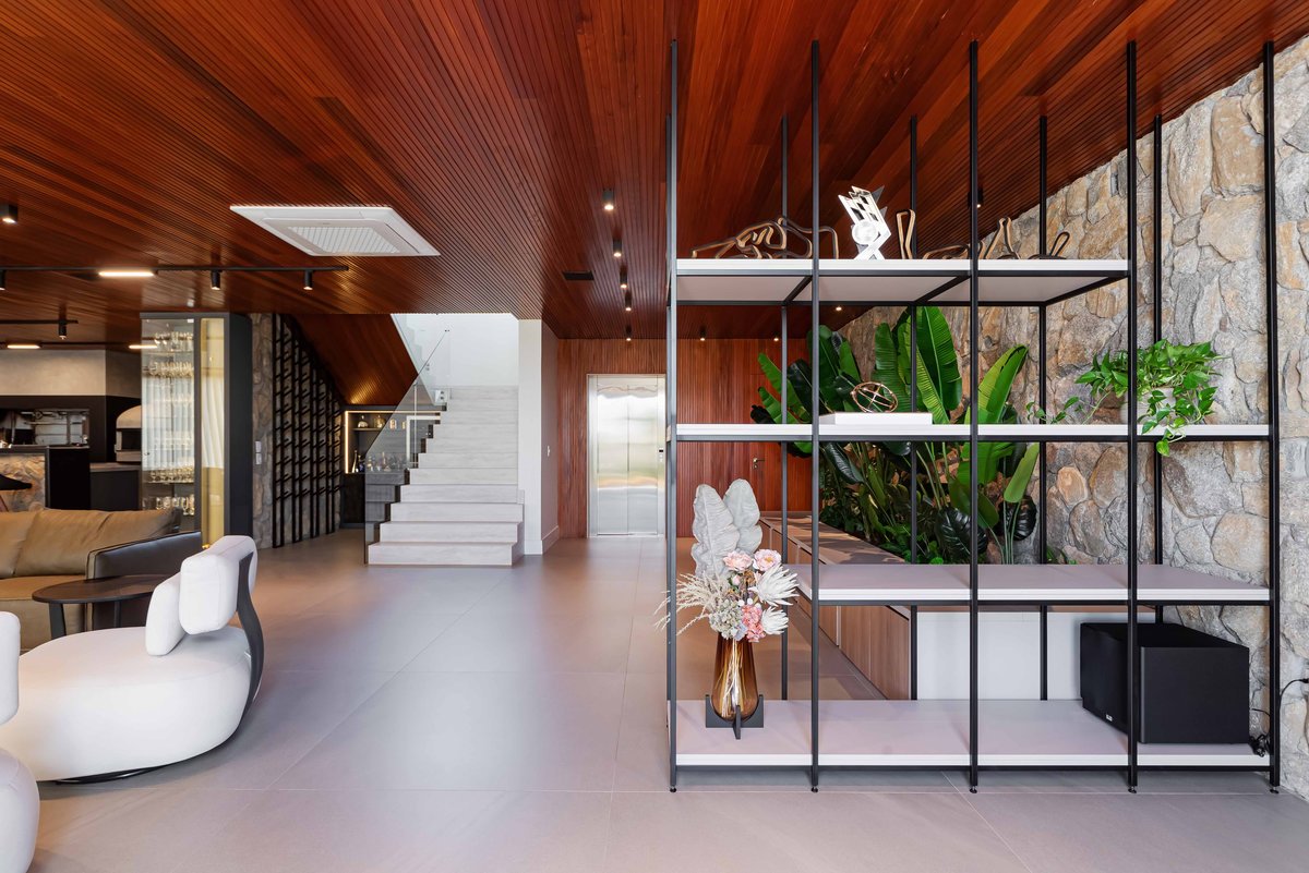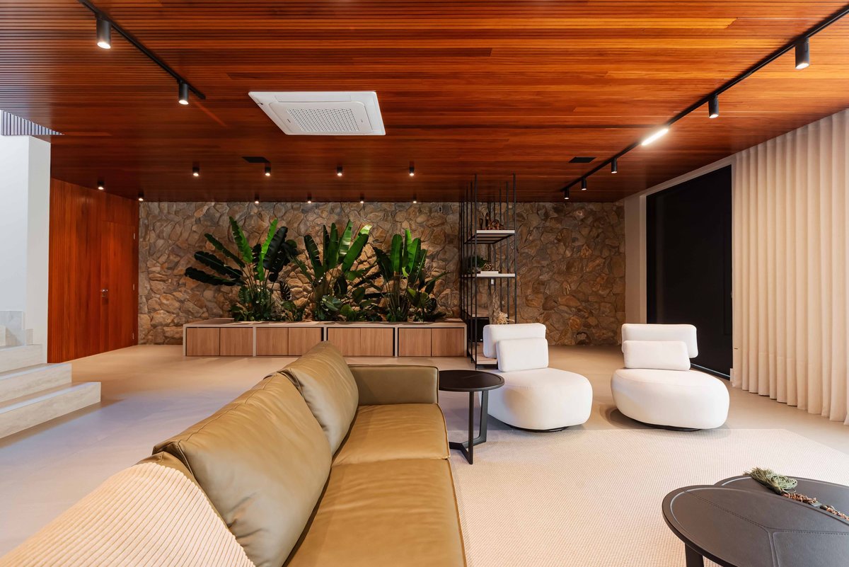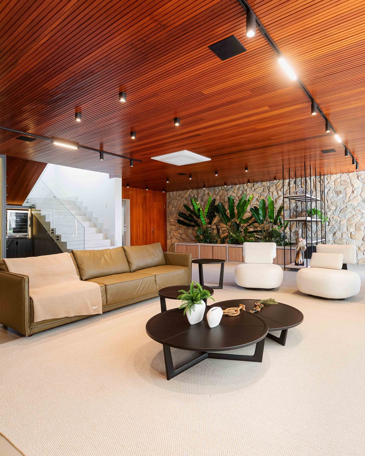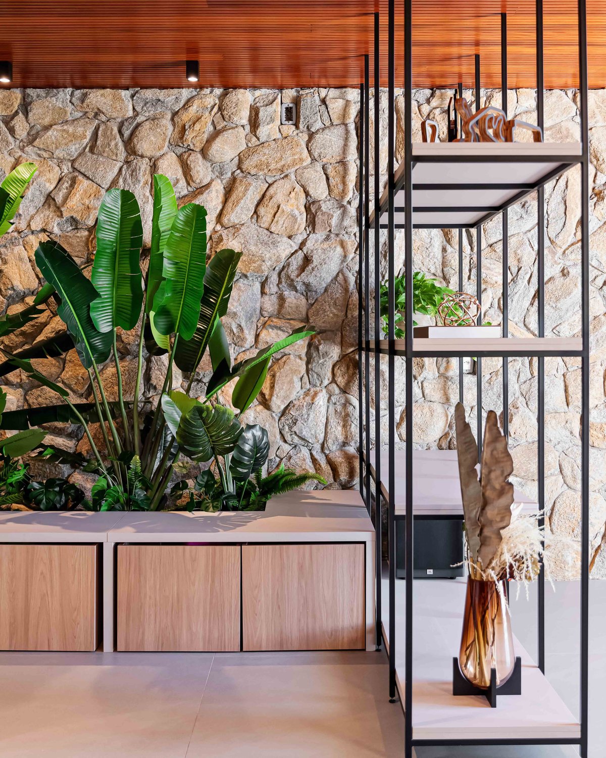 Cada detalhe traduz a essência do design: a adega em ferro, o jardim integrado e o forro ripado em madeira garapeira transformam o espaço com elegância e personalidade.