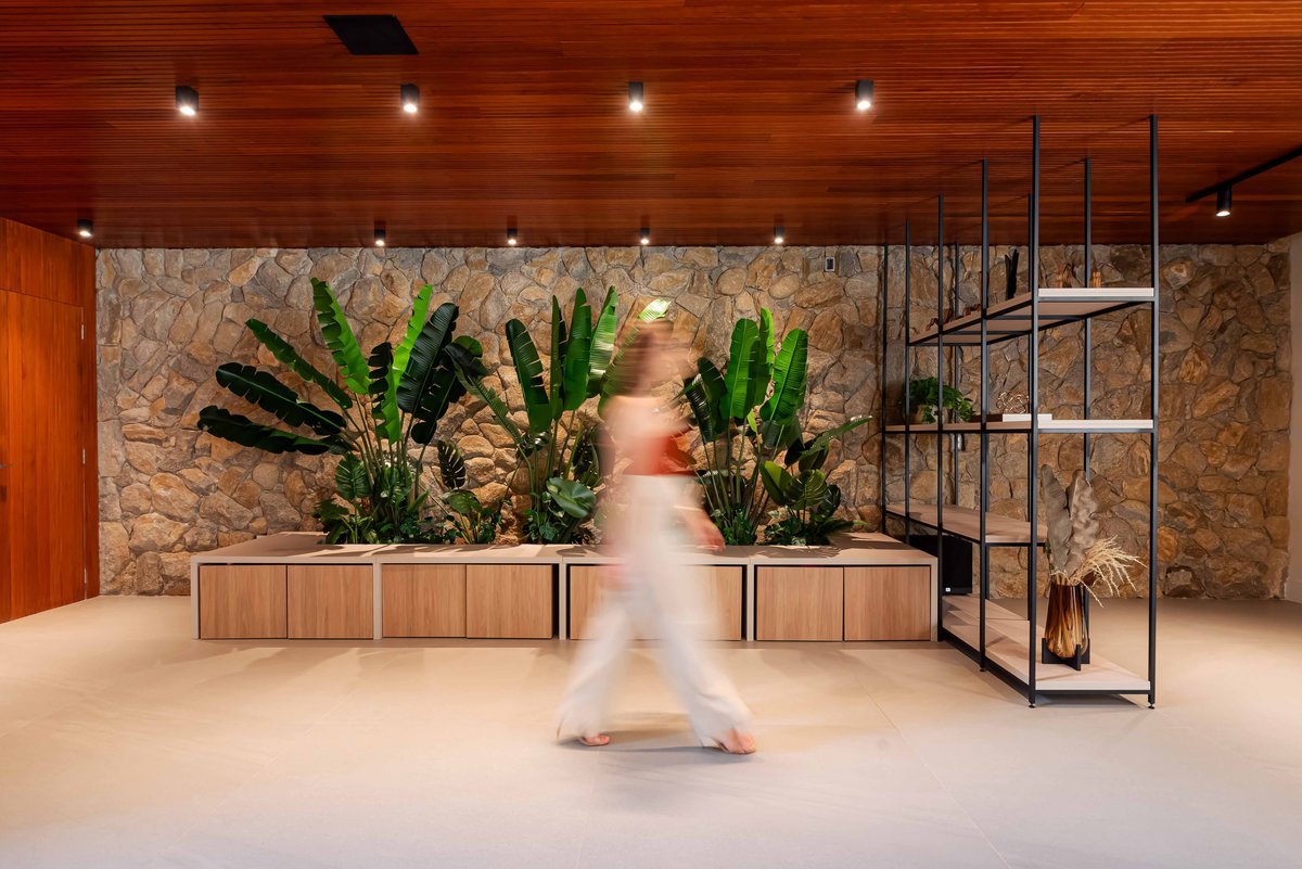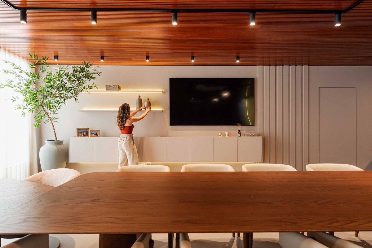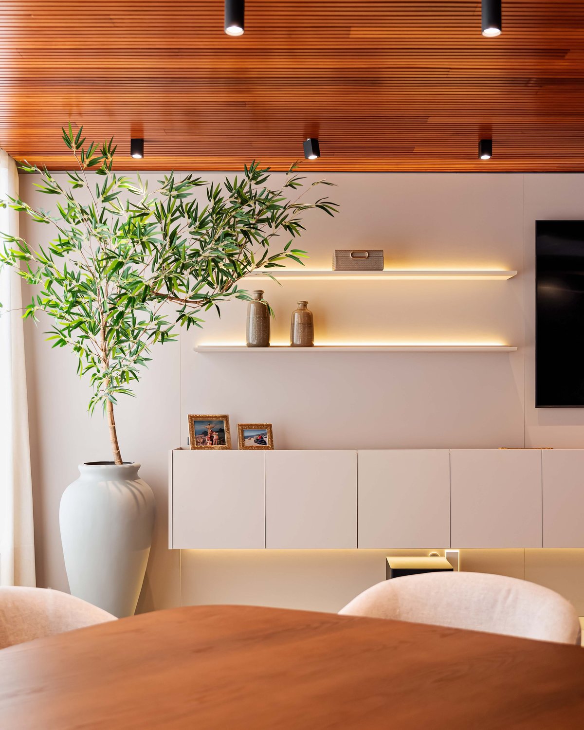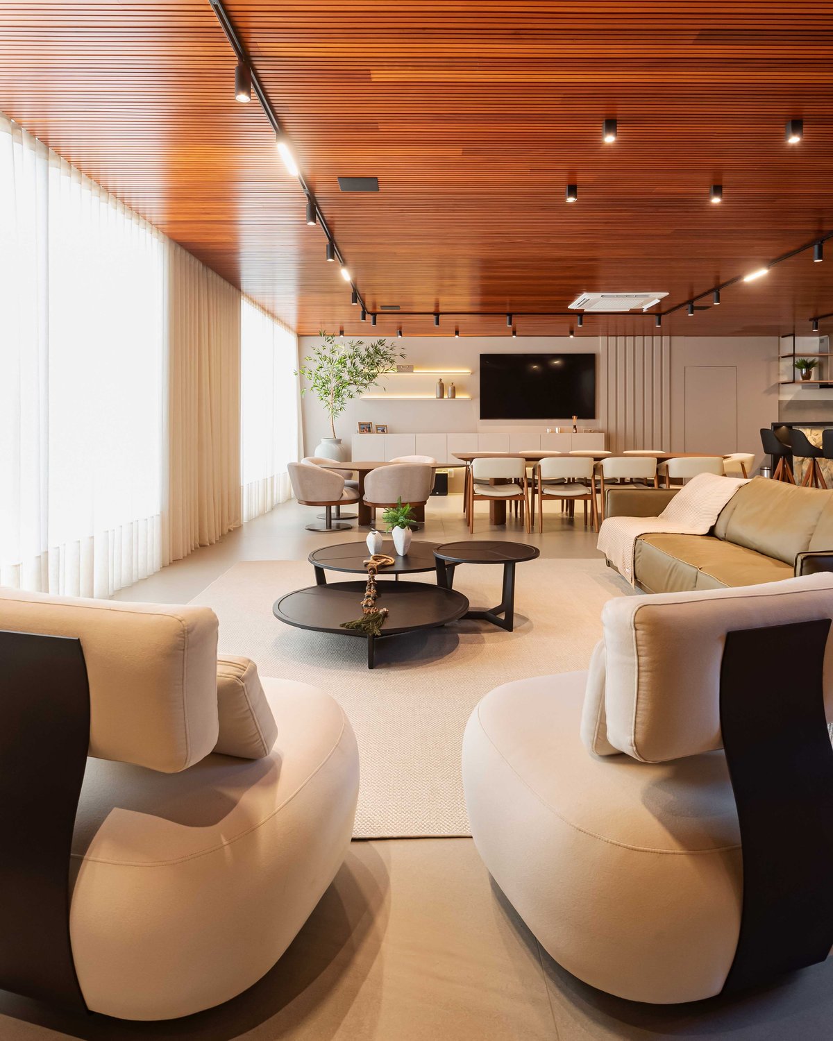 Cada detalhe traduz a essência do design: a adega em ferro, o jardim integrado e o forro ripado em madeira garapeira transformam o espaço com elegância e personalidade.