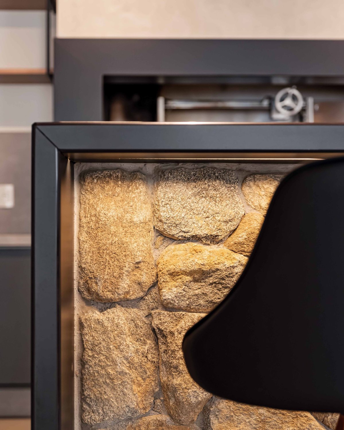 A cozinha gourmet, ampla e funcional, conta com bancada generosa, forno de pizza à lenha e áreas de apoio preparadas para grandes encontros. A mesa de jantar se conecta ao painel da TV, compondo um cenário refinado e acolhedor. A área de estar, voltada para as grandes aberturas com vista para a piscina, aproxima e intenciona a convivência e a contemplação da área externa. Na entrada, o uso das pedras moledo presentes na fachada cria continuidade entre o externo e o interno, reforçando a identidade do projeto.