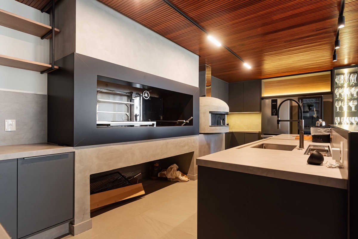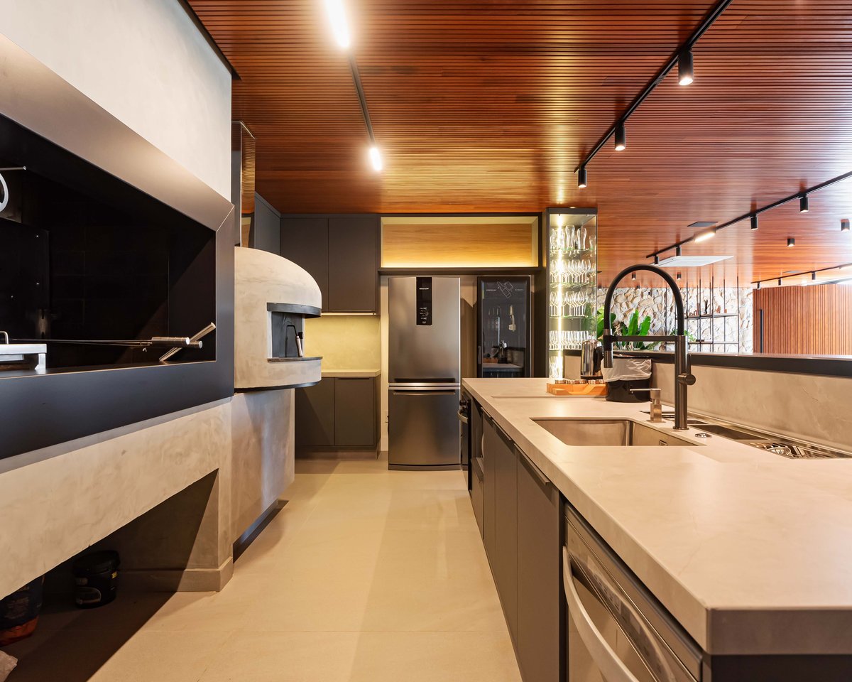 Um espaço gourmet projetado para receber, viver e celebrar, o ambiente integra cozinha, estar e jantar em perfeita harmonia.